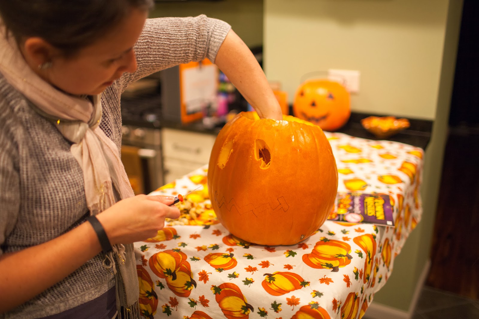 First up, we carved the pumpkin! Nick helped a little by cutting the top off for me. He isn’t one to stick his hand in the pumpkin guts and scoop out all of the insides. He left the messy part to me. I was debating about getting fancy with my carving but quickly realized I am not much of an artist. I decided to just stick with the traditional pumpkin face. I mean, it did not come out half bad for being an amateur carver.