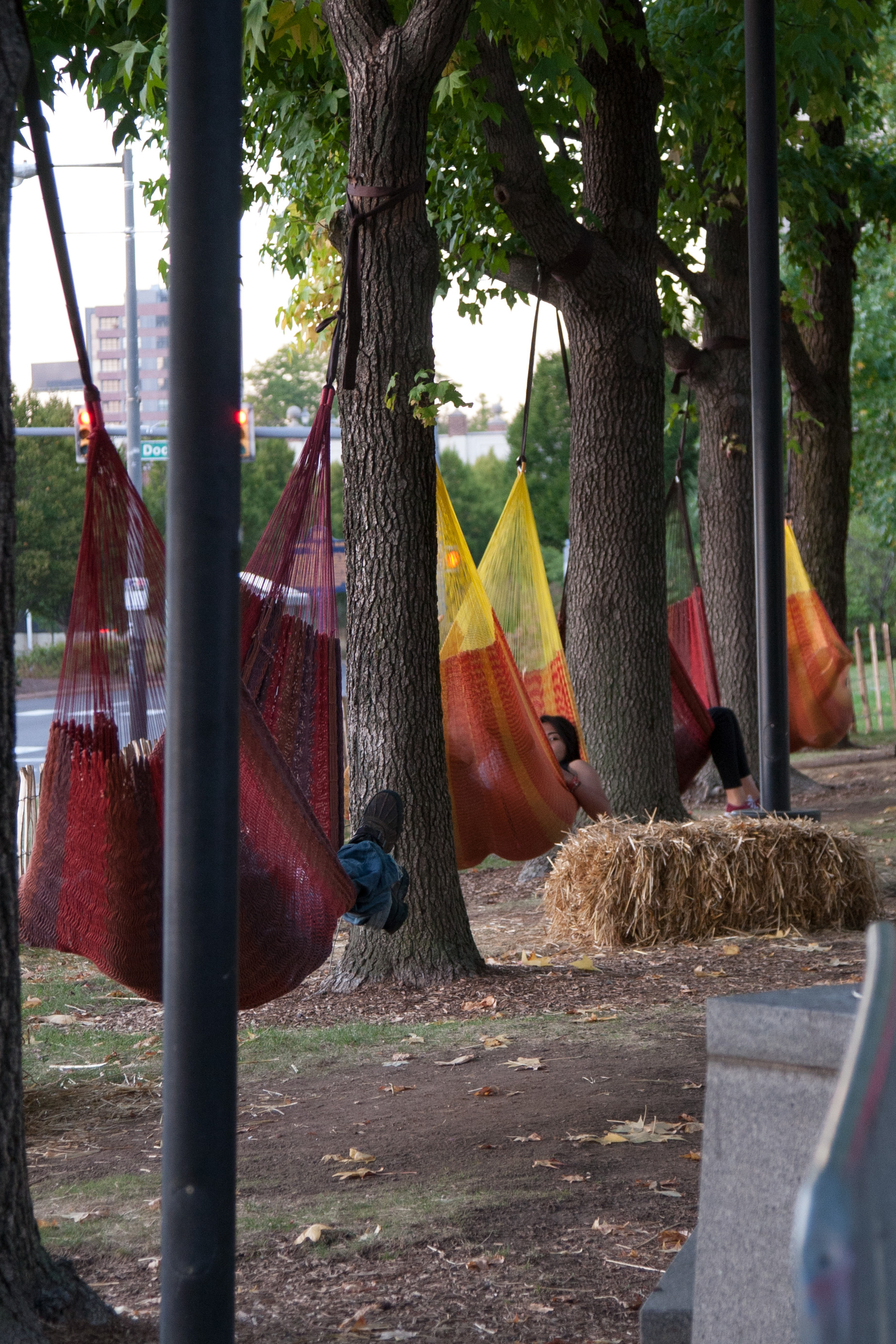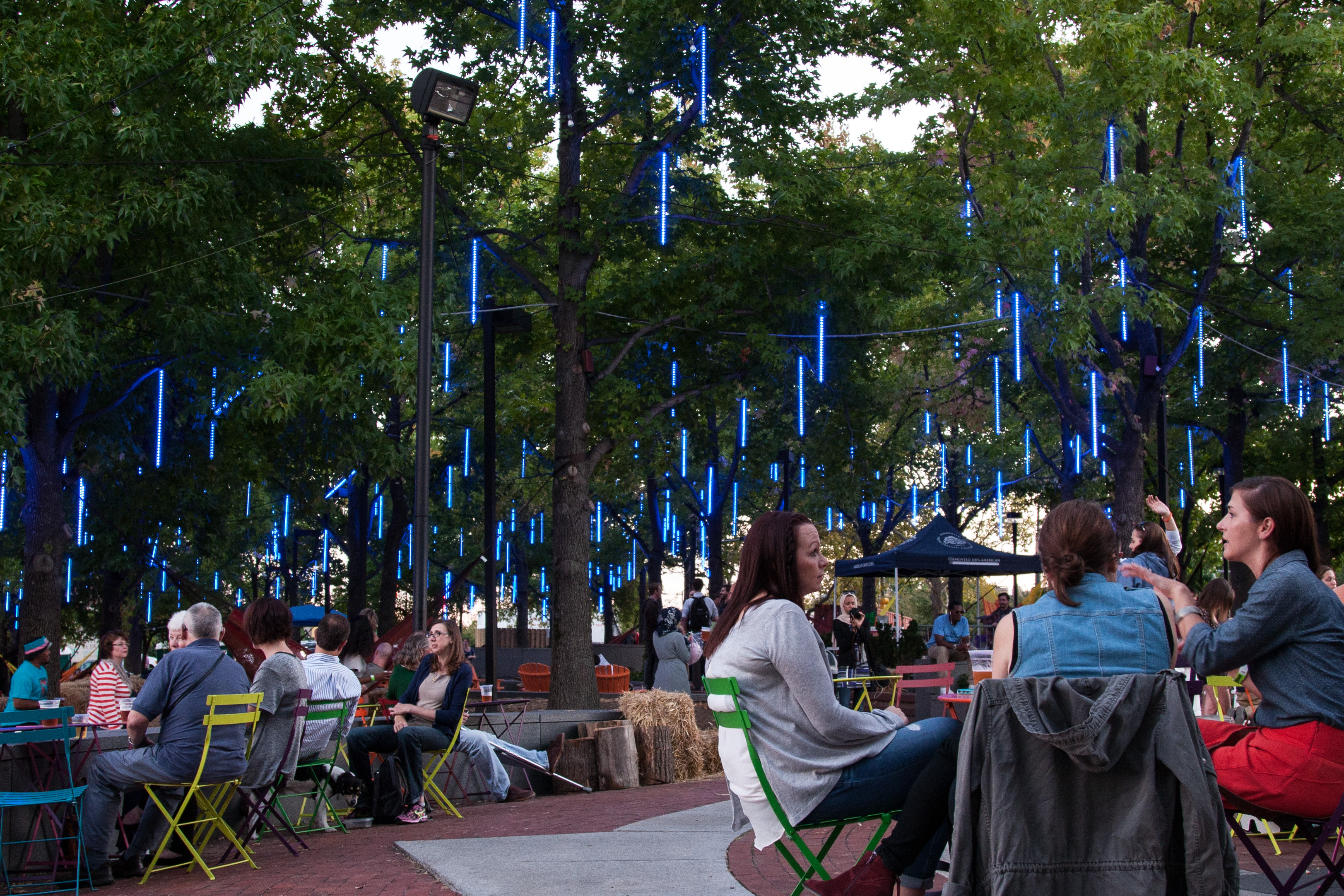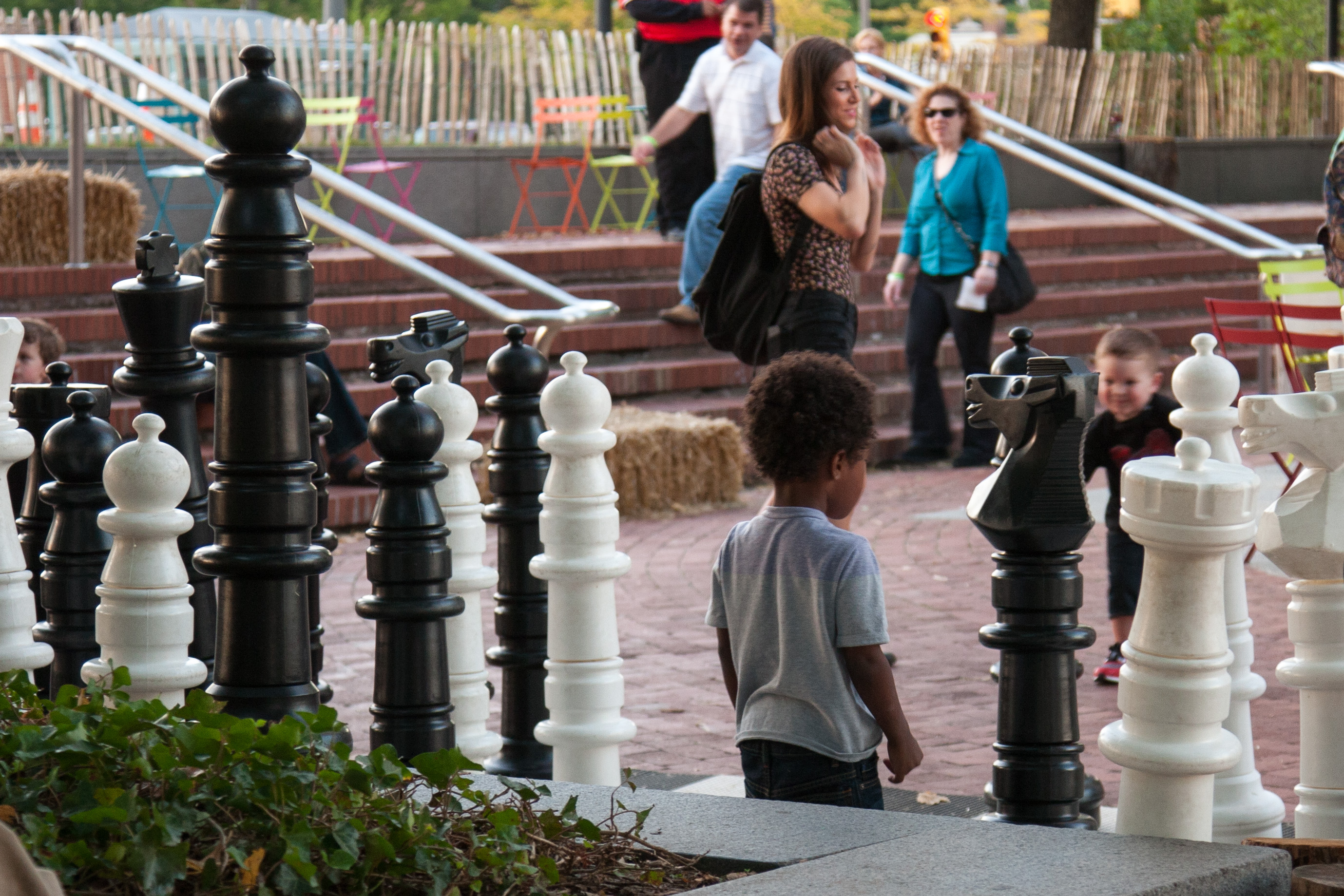 After freshening up, we headed down to Old City for the evening. We started down by the Delaware River at the Spruce Street Harbor Park. This park was set up for the summer, with the past weekend being the last. It was pretty impressive. There were lights hanging from the trees that changed colors, cozy hammocks and comfy lawn chairs for people to relax, food and drink vendors throughout, and my favorite, the oversized game pieces for kids (and adults) to enjoy.