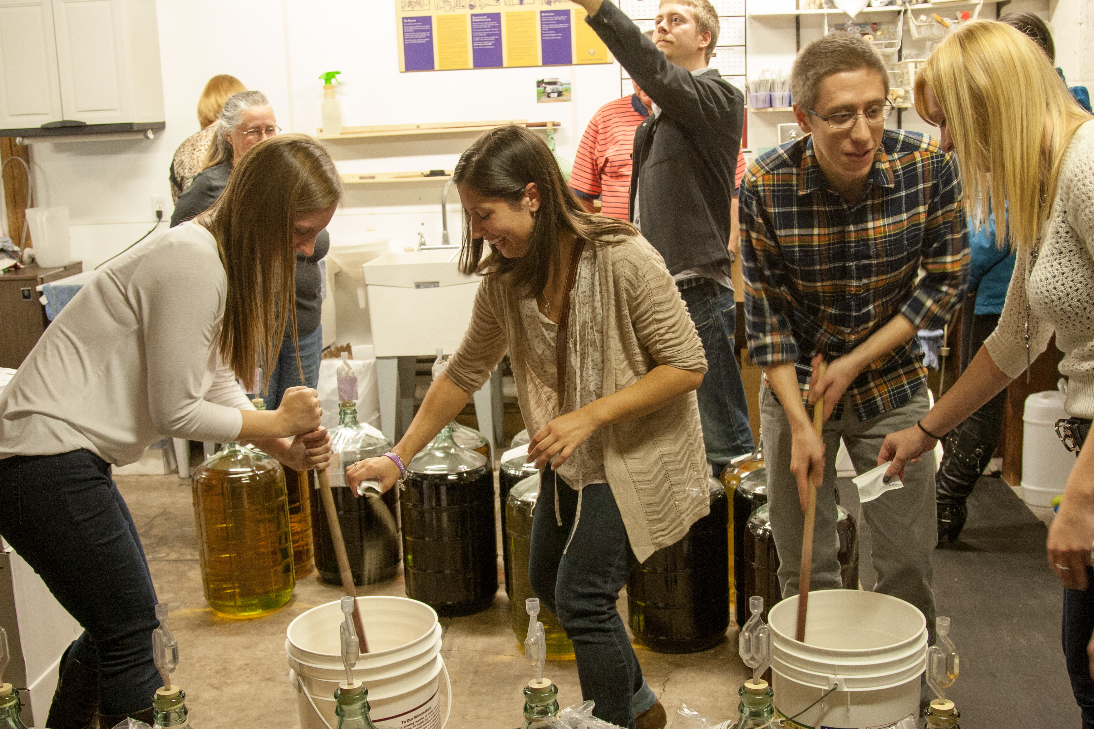 After completing all of the tastings, the group picked the wine for Theresa and Matt to make. To add to the fun, they were going to make the wine right then and there. With the help of the Maid of Honor and Best Man (and a few other friends), they combined two containers of wine mixture. Of course it turned into a competition of who could finish their batch first. I’m still not 100% on who won. Either way, they had a great time! The couple will be going back in December to bottle the finished product and design their labels.