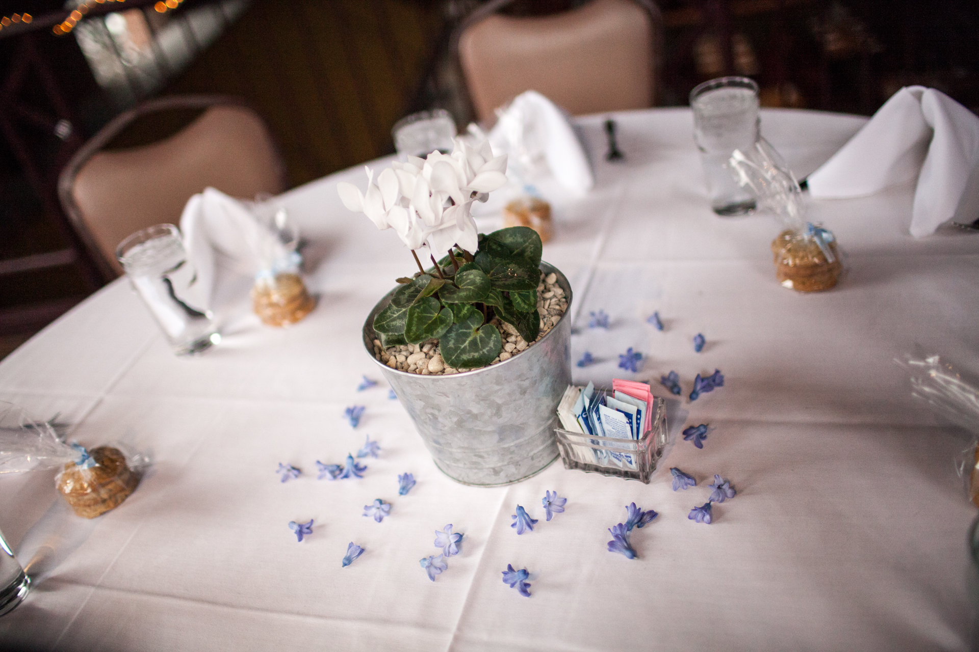 For decor, we kept it simple and elegant. I requested white linens for the tables. Tara came up with beautiful centerpieces that doubled as the prizes. She found silver tins at the craft store that she placed potted plants in. Tara really has a knack for planting. We were originally going to place votive candles around the plants but decided against it. Instead, Tara came up with the idea of flower petals for a pop of color.