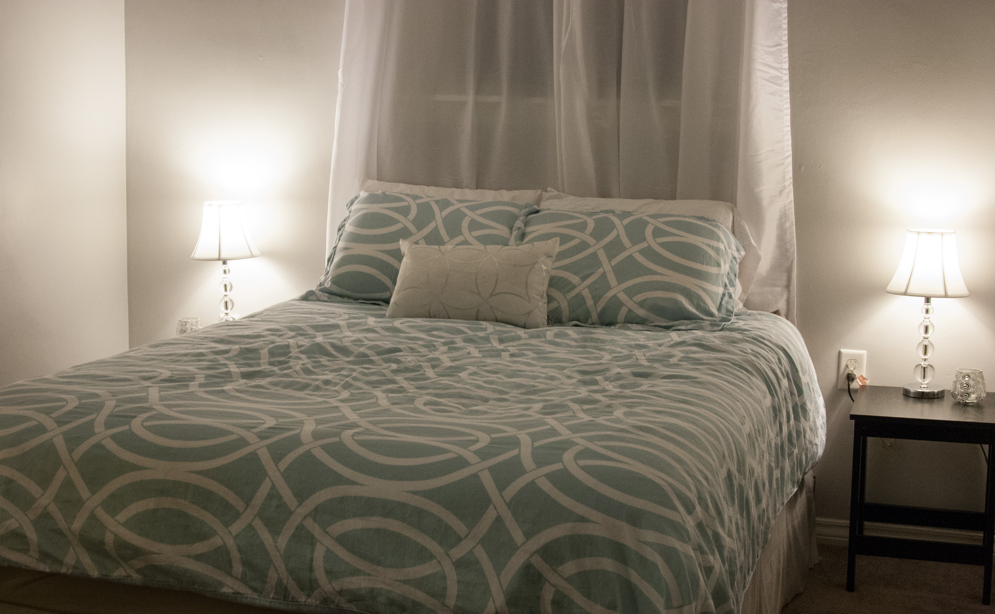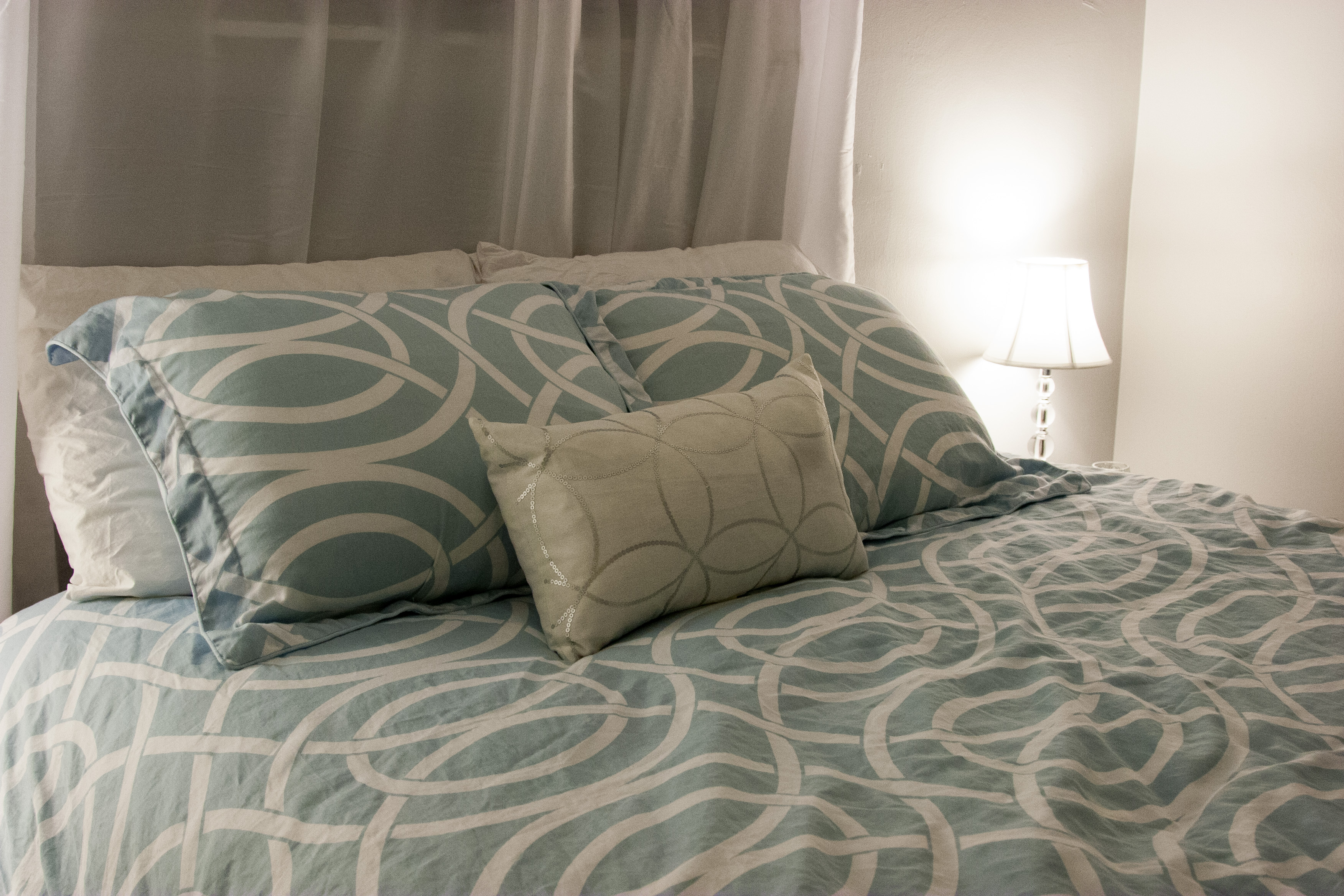 After we moved in, it was definitely an acceptable room for the time being. Time has passed though and I was ready for a change. I picked up a new bedding set, curtains to match, and a few pieces to tie the room together. All of these items were purchased at Home Goods or Marshall’s, two of my favorite stores. I also spruced up the floor length mirror and dresser handles with silver sprain paint. Aside from a few custom prints to hang on the large wall, the room is finally complete! What do you think?