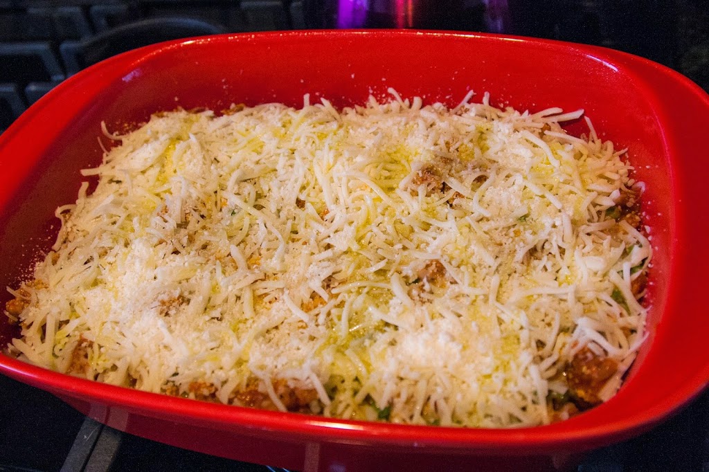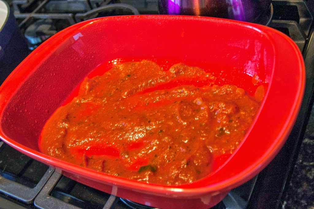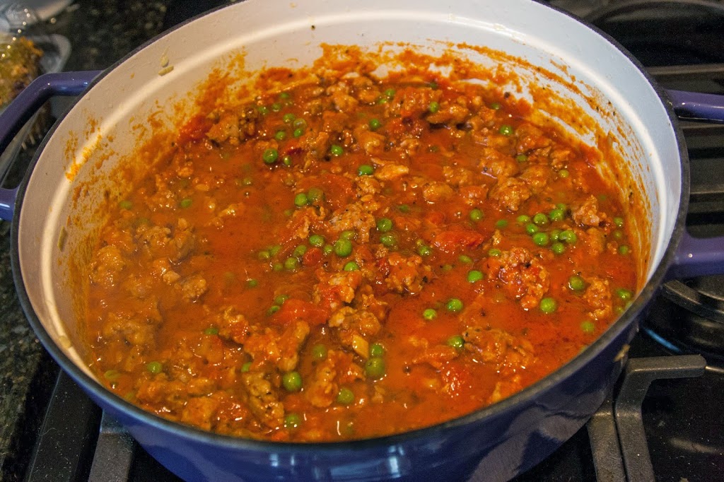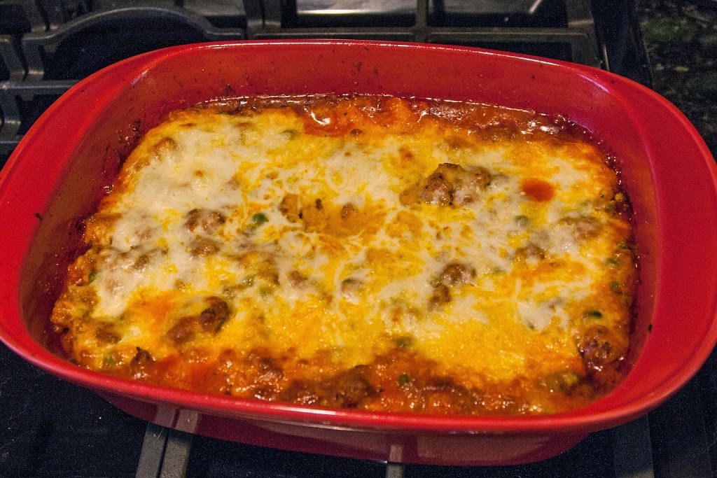 Set aside about 1/2 cup of marinara sauce. Pour the remaining sauce into the sausage mixture. Add in the crushed red pepper and allow to simmer for about 5 minutes.