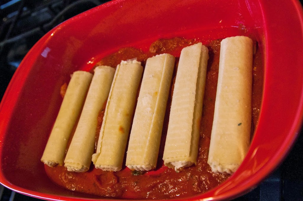 Spread the half cup of plain marinara sauce on the bottom of the baking dish. Arrange the frozen manicotti in a single layer over the sauce. Pour the sausage mixture over the manicotti shells. Top with mozzarella cheese and a handful of Pecorino Romano cheese . Drizzle with olive oil and bake until bubbly and golden brown, about 40 minutes.