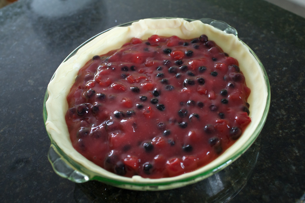 Ingredients 1 package refrigerated pie crust 1/2 cup sugar 2 Tbsp corn starch 1/4 tsp cinnamon 1 can (21 oz) cherry pie filling 1 1/2 cup frozen blueberries 1 egg white 1 tsp water 2 tsp sugar Directions Preheat oven to 425 degrees Fahrenheit. Place one pie crust in the bottom of 9-inch pie dish. Press against the sides and bottom. Mix together sugar, corn starch, and cinnamon until combined. Stir in pie filling and blueberries until blended well. Spoon pie filling mixture on top of pie crust. Roll out top pie crust on a flat surface. Take a small star-shaped cookie cutter and cut out 3 stars, saving the crust. Beat together egg white and water until blended. Brush mixture over top of pie crust. Place cut out stars to decorate the top. Brush the stars with egg wash mixture. Sprinkle sugar across the top of the pie crust. Cover crust of pie with foil to prevent burning. Bake for 45-55 minutes, until crust is golden brown. Slowly remove foil and bake for an additional 10 minutes or until crust is browned. Allow to cool for 2 hours.