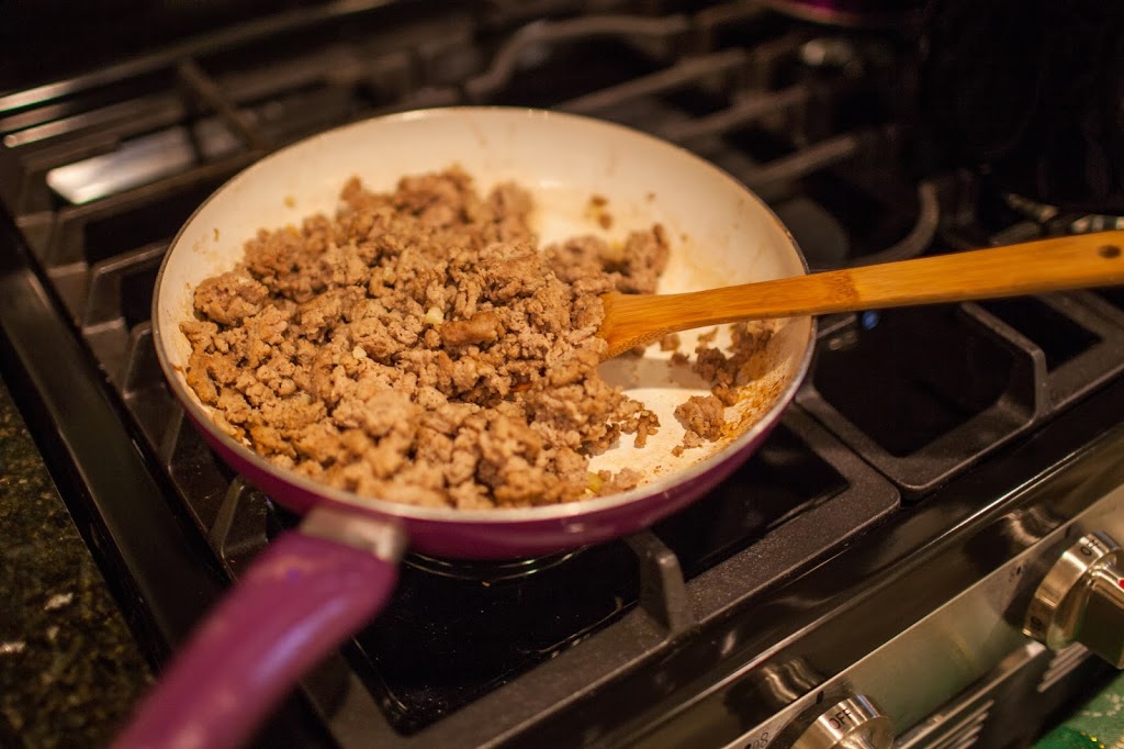 Drizzle olive oil into pan and saute garlic for about 30 seconds. Add in ground turkey and cook until browned. Drain excess liquid.